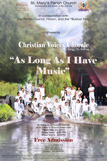 On 24 November 2011, the Christian Voices Chorale celebrated the feast of St. Cecilia, the Patron Saint of Music with the concert “As Long As I Have Music”.